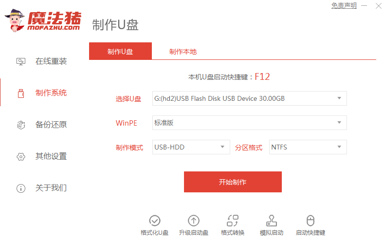1.我们先准备一张10G存储器空白u盘,然后打开我们的魔法猪一键重装系统软件,选择“制作系统”按下开始制作。