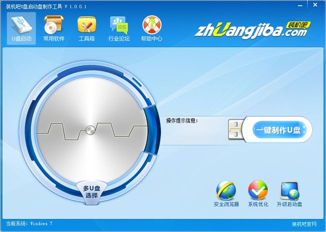 1、先下载U盘装机吧一键重装系统工具(下载地址:http://www.zhuangjiba.com/),下载之后安装,插入U盘点击一键制作U盘