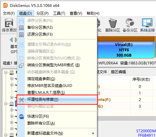 1、首先自行下载安装diskgenius工具并打开,插入u盘等移动硬盘进电脑,选择需要检测坏道的移动磁盘,点击“磁盘 - 坏道检测与修复”菜单项。