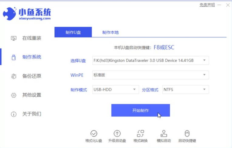 1、先在一台可用的电脑上下载安装小鱼一键重装系统工具并打开,插入一个8g以上的空白u盘,选择开始制作。