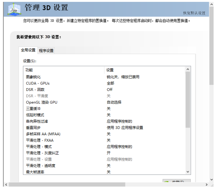 2、全局3D设置为高性能NVIDIA处理器(各项功能可自定义调节)。