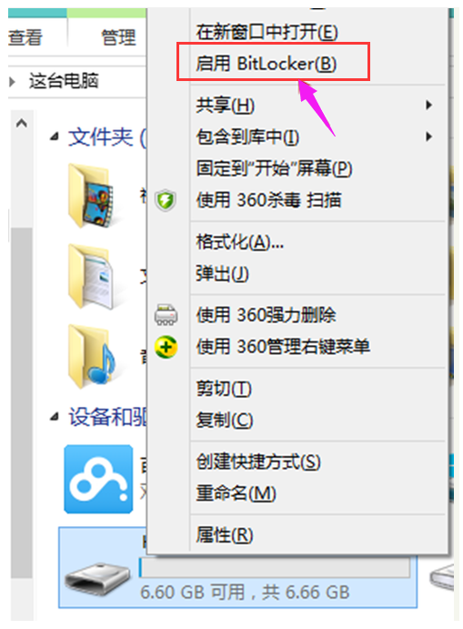 1、把U盘插入电脑,打开计算机,右键点击U盘,选择启用BitLocker。