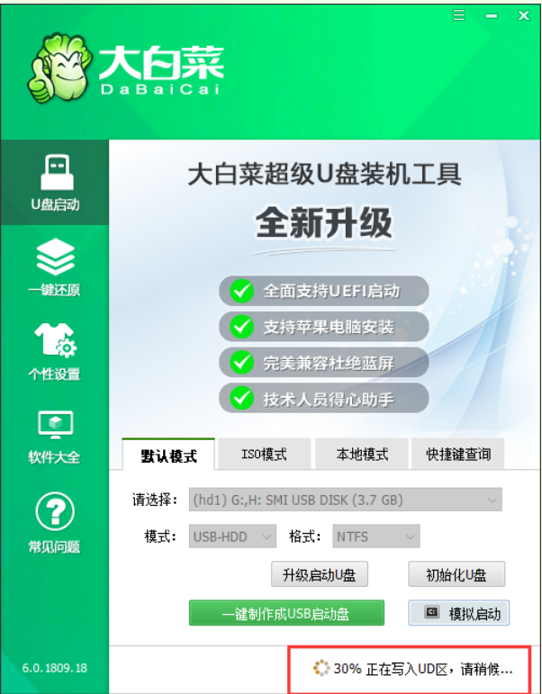 4、 这时候大白菜装机版U盘工具对U盘写入大白菜相关数据