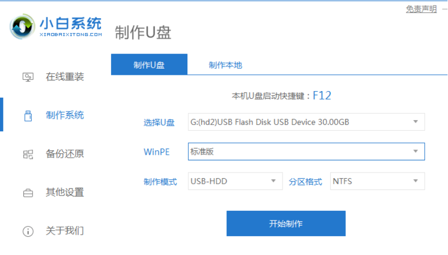 1.打开【小白一键重装】软件,将u盘插到电脑当中,选中制作系统,点击【开始制作】。
