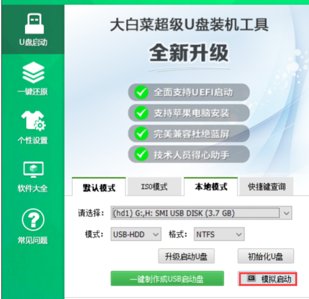 1.大白菜u盘启动工具怎么使用,首先点击主界面上的“U盘启动”模块,点击【默认模式】。