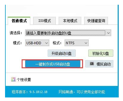 3、选择普通模式选项卡,“请选择”中选择插入的U盘设备名称(一般会自动识别)。模式选择USB—HDD,格式选择“NTFS”