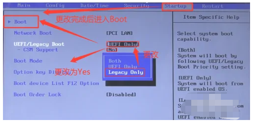4、使用方向键切换到“Starup”界面,如图所示的步骤操作,将“No”改为“yes”后选中Boot项进入新界面。
