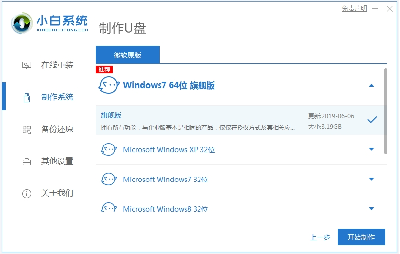 2、选择需要安装的系统,点击开始制作u盘启动盘。