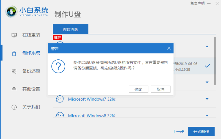 3.单击小白按钮重新安装系统时系统会弹出警告。它将会提示您备份U盘中的文件。我们只需要点击“确定”即可。