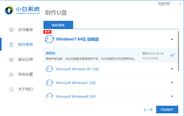 1.pe是什么意思?pe就是windows预安装环境,是为windows安装而准备的容量最小的电脑操作系统,首先我们把U盘插入电脑,打开下载安装好的小白一键重装系统,单击左侧选项栏中的【制作系统】进入【制作u盘】界面,点击【开始制作】。