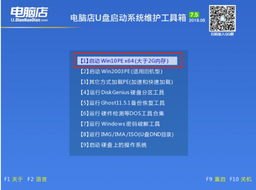2、进入电脑店主菜单后,通过“↑↓”键选择【1】后回车确认,成功进入winpe。