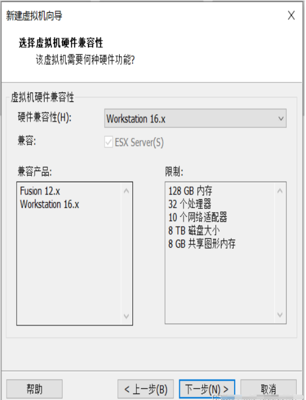2、在硬件兼容性选项,选择Workstation 16.x进入下一步。