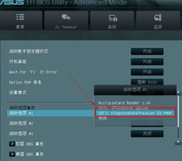 5、电脑弹出选项窗口,通过上下方向键选UEFI开头的,切换后,启动选项#1会显示成u盘启动了。