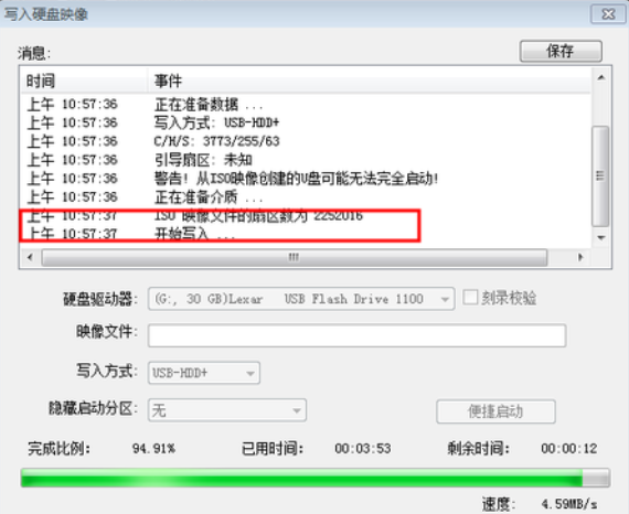 4.选择u盘之后,写入方式选择“USB-HDD+”,点击写入就可以啦。