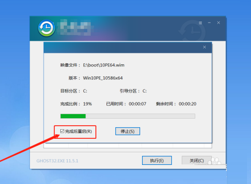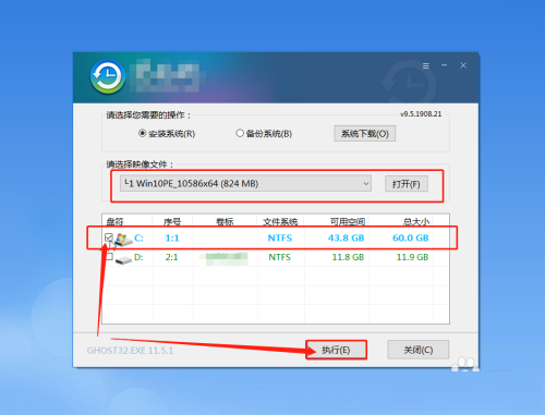 3、进入winpe桌面后,打开winpe一键装机,如下图所示勾选,选中之前已下载的镜像系统,安装在“C盘”,点击“执行”