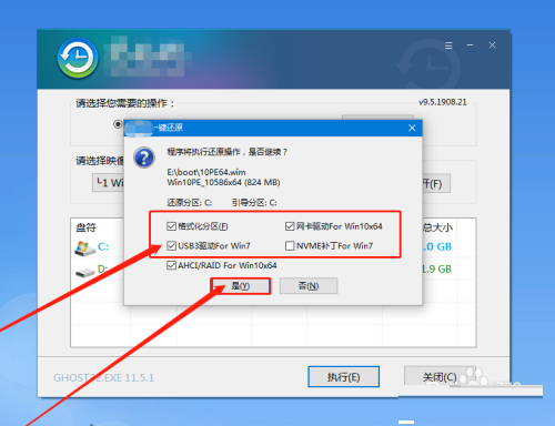4、出现一键还原窗口时,建议勾选“网卡驱动”以及“USB驱动”复选框,防止重装后出现网络连接不上或者鼠标无法使用的情况,点击“是”进入下一步