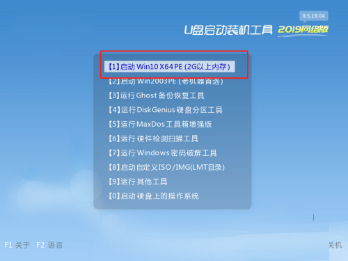 2、选中【1】Win10X64PE(2G以上内存),按回车进入下一步
