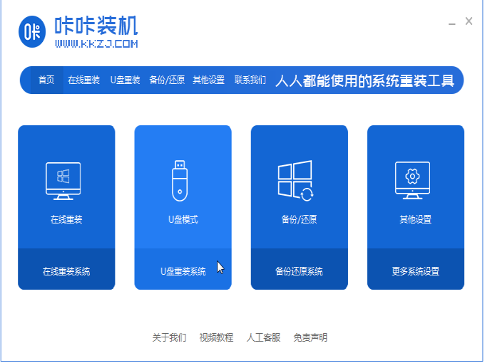 1、怎么用u盘给电脑重装系统?下载安装咔咔装机软件并打开,并将u盘插入电脑。选择“U盘模式”进入。