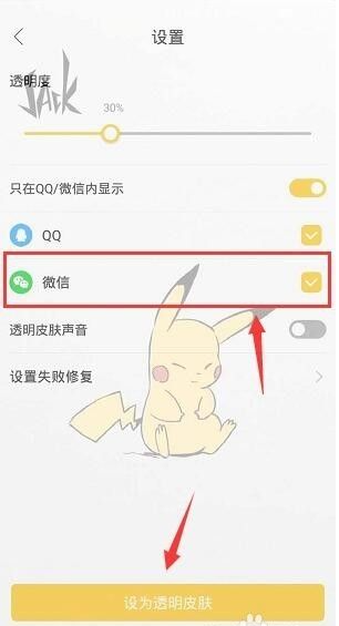 7、记得在设置页面里点击打勾微信,下载完之后点击 设为透明皮肤,如下图