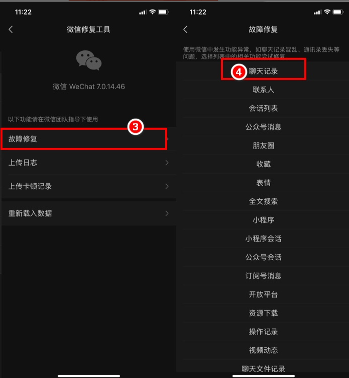 3、进入页面后会有一个故障修复,点击进去就可以看到有聊天记录的选项了,只需确定即可恢复聊天记录了。