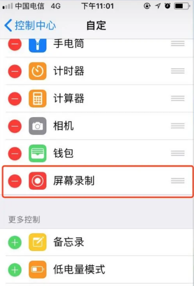 3.进入自定控制页面后,找到屏幕录制,点击加号