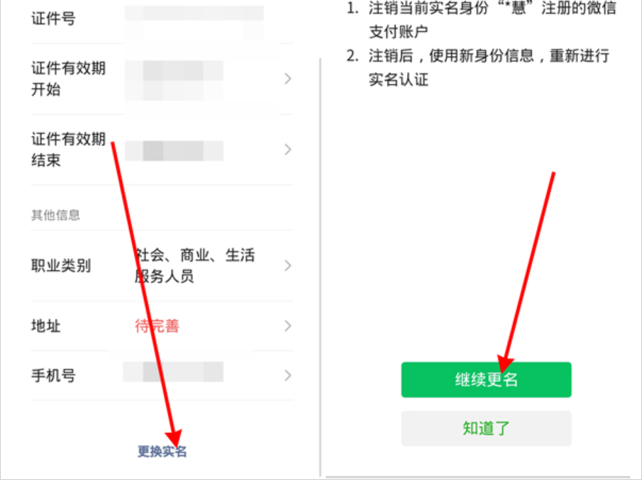 3、点击最下方的【更改实名】,点击继续更名,根据提示操作即可。