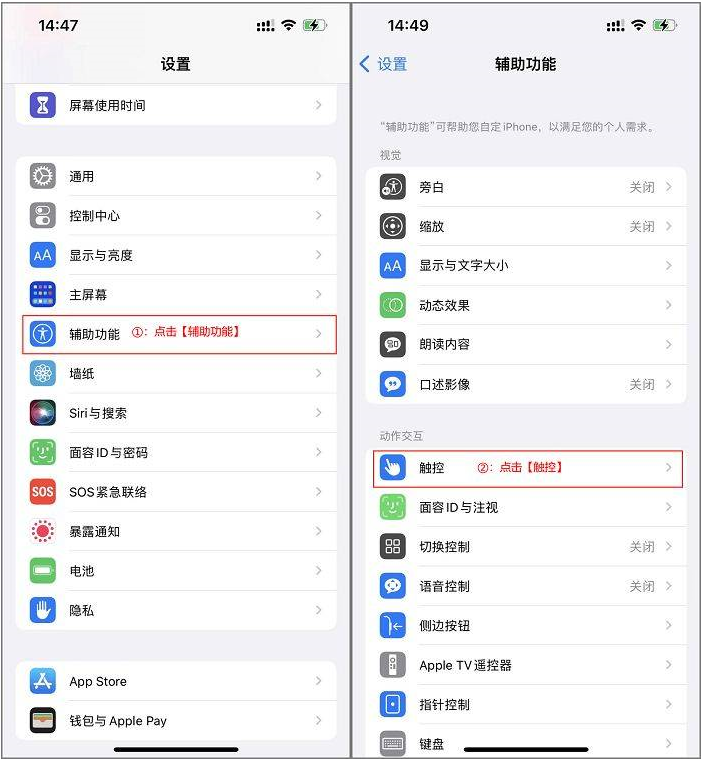 1、打开苹果手机中的“设置”,找到“辅助功能”后点击“触控”。