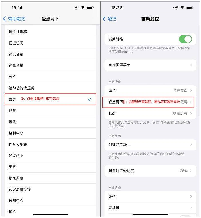 3、找到“截屏”并勾选然后返回,看到“轻点两下”的按钮中出现了“截屏”则表示设置完成了,以后只需要轻点两下即可截图。