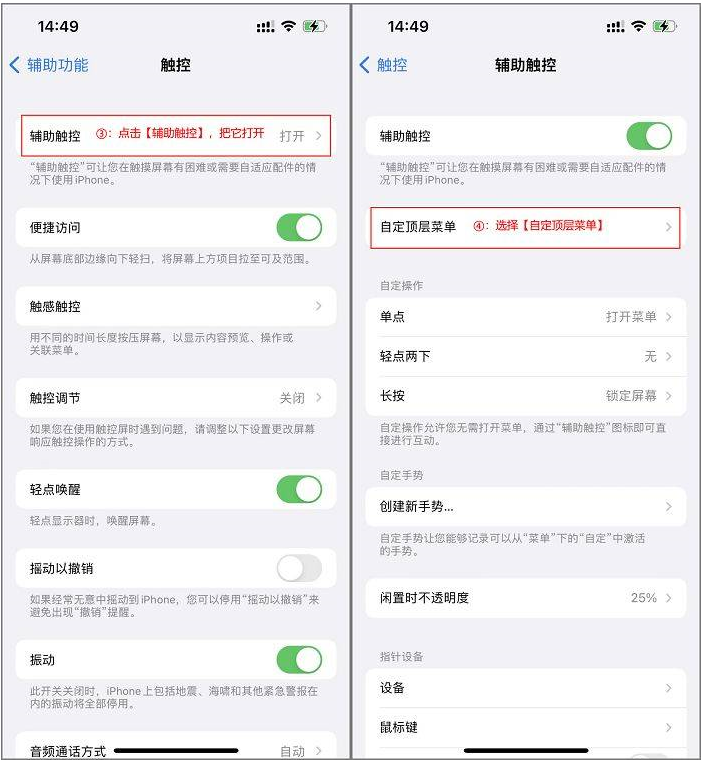 2、再把“辅助触控”按钮打开,点击“自定顶层菜单”。