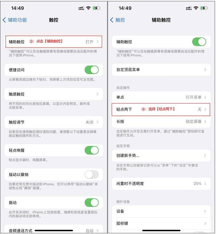 2、在“触控”中把“辅助触控”打开,然后再“轻点两下”。