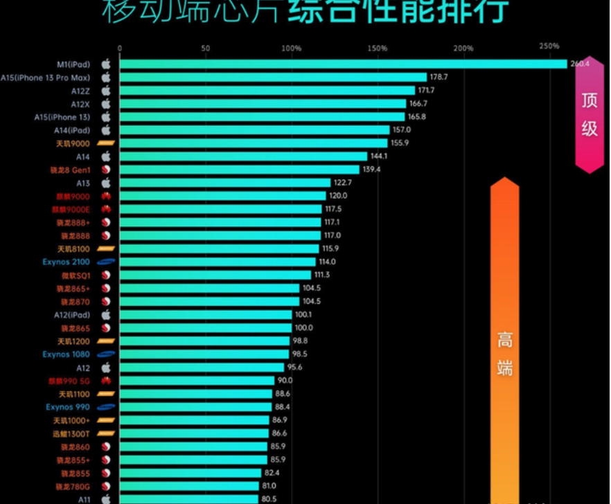 下面就是目前最新手机CPU性能排行榜,手机处理器天梯图。