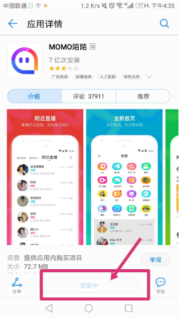 3、显示的结果中,选择下方的”MOMO陌陌“,点击安装。