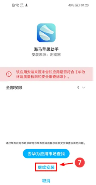 5、忽略华为的安全检测即可,点击“继续安装”,完成之后就可打开海马苹果助手啦。