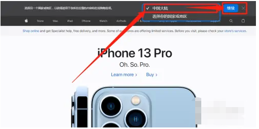 2、当进入英文版苹果官网页面之后,在右上方选择地域选项,点击中国大陆然,再点击继续即可。