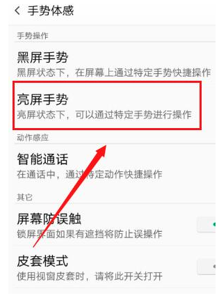 2、接着我们在手势体感页面中点击亮屏手势。