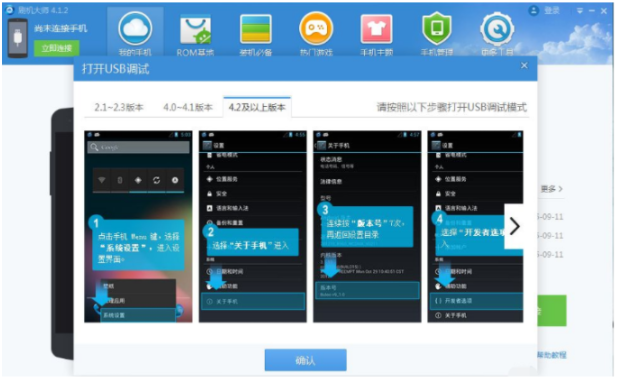 2、手机连接到电脑,在手机设置中找到USB调试开启,这样才能连接到刷机大师工具。
