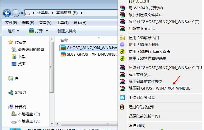 1.首先下载需要安装的系统,小编这里重装win7系统为例说明,系统下载完毕后,鼠标右键使用WinRAR等工具解压到当前文件夹或即可,小编这里解压的是F盘。