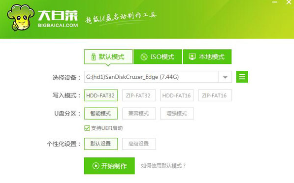 1、打开大白菜,U盘插入电脑,使用默认模式点击开始制作