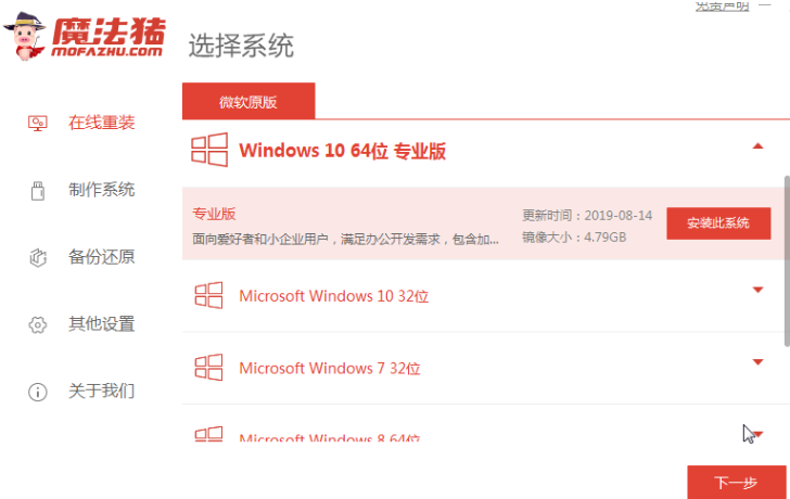1、打开浏览器搜索魔法猪官网,下载打开魔法猪系统重装大师,点击在线重装,选择需要安装win7系统,点击安装此系统。