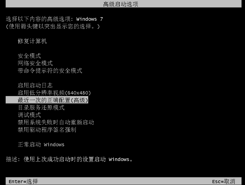 1、首先如果是在 Windows 标志出来之前黑屏,我们按下开机键重启电脑,然后不停的点击 F8 键,进入高级选项,选择最近一次正确的电脑配置。还是不行就选择上方的安全模进入,查杀一下病毒,卸载最近安装的驱动,特别是显卡驱动特别容易导致此问题。