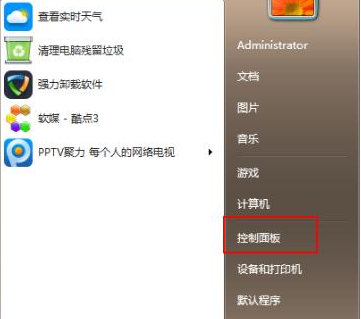 1.先点击win7系统主菜单,打开控制面板页面。
