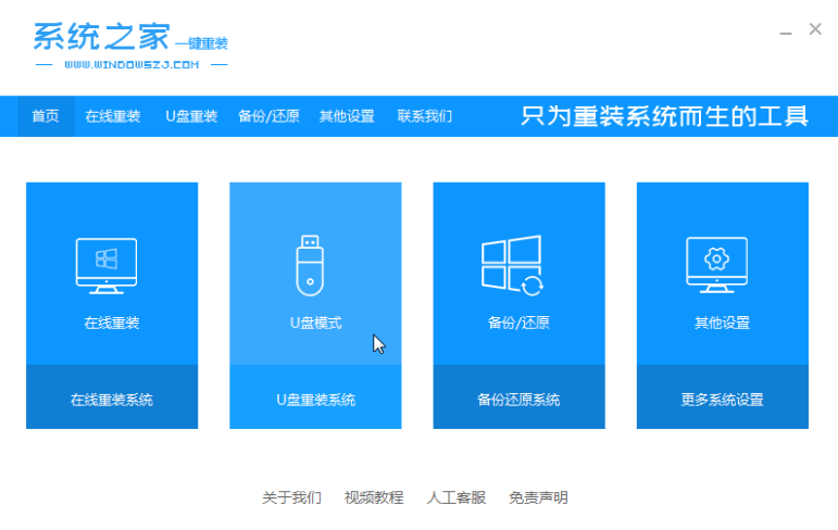1.我们将准备好的空白u盘插到电脑当中,接着打开【系统之家一键重装系统】,在进入的首页中点击u盘重装功能。