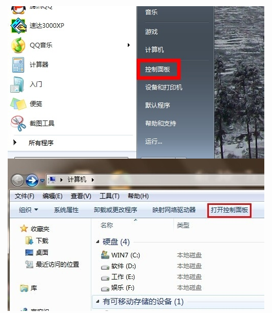 1.在电脑左下角的开始菜单里找到“控制面板”选项,也可以打开我的电脑,在上方导航栏里点击“打开控制面板”;