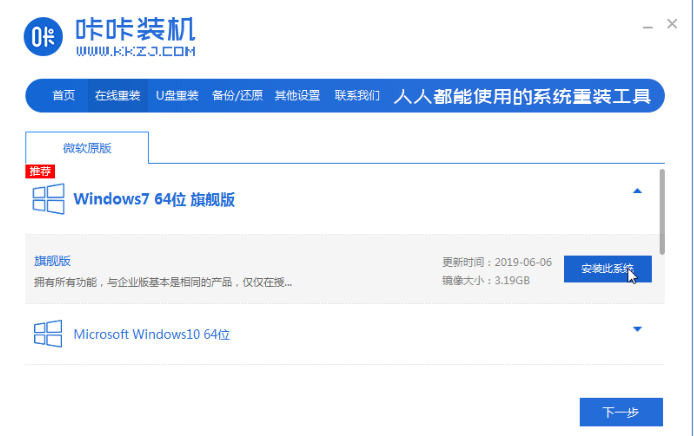 1、首先进入到【咔咔装机】工具当中,选择win7系统进行安装。