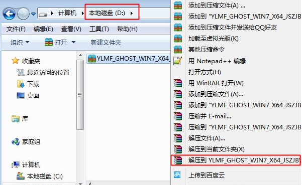 1、下载好雨林木风win7镜像文件,放到C盘以外的分区,右键解压它。