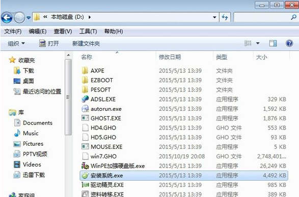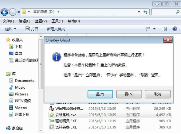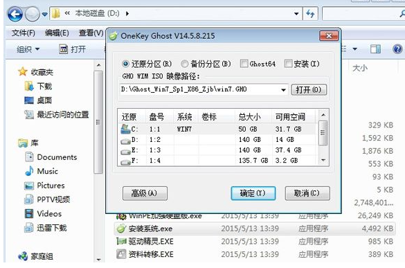 2、在目录下双击【安装系统.exe】,打开安装工具onekey ghost,选择“还原分区”,加载映像路径win7.gho,选择安装位置如C盘,点击确定。