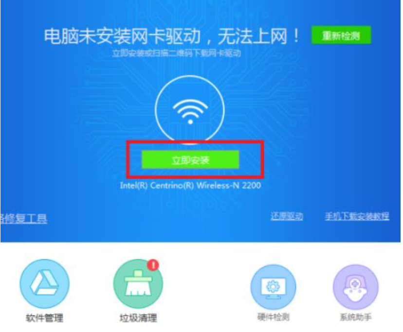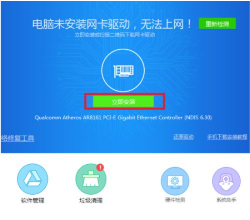 安装驱动精灵网卡版软件检测修复网卡驱动;