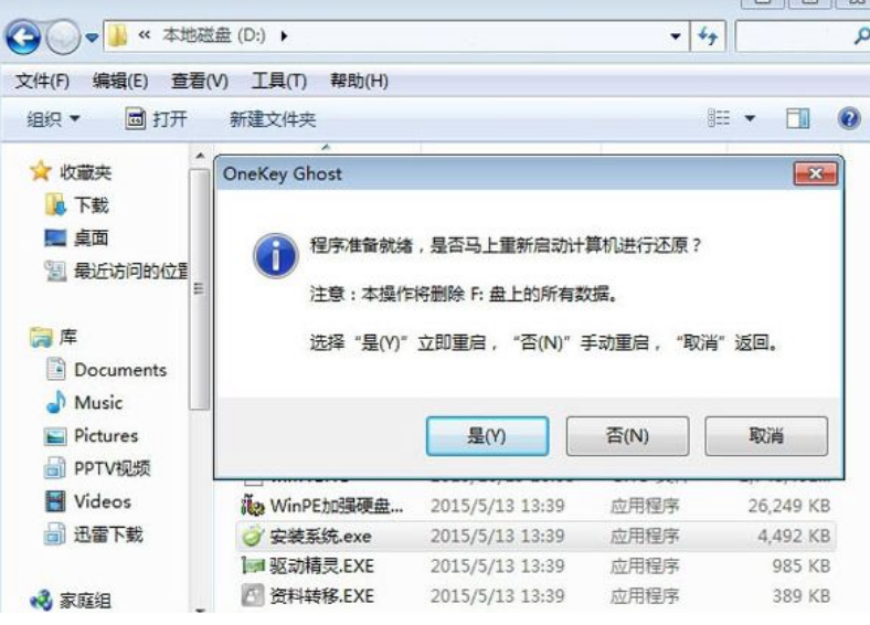 4、弹出提示框,程序准备就绪,直接点击是,立即重启进行计算机还原。