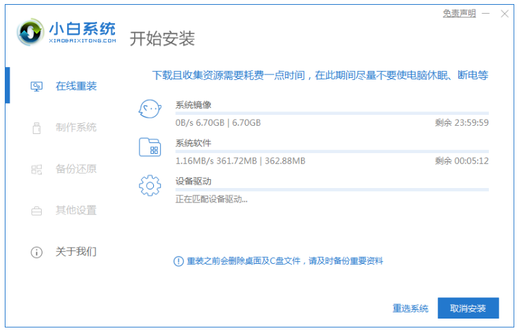 步骤五:那么小白就会自动重装系统了,此时我们只需要等候就可以了,小白系统会自动帮我们重装好系统的。