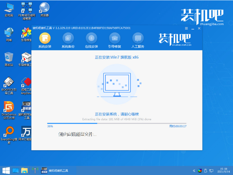 步骤四:电脑进入PE系统之后,电脑就开始安装win7系统啦,安装完成后,重启电脑。